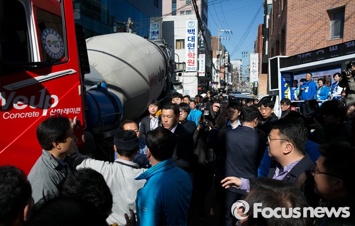 (서울=포커스뉴스) 4일 오전 전혜숙 더불어민주당 서울 광진갑 후보 선거사무소 인근 골목에서 김종인 비대위 대표 겸 선대위원장과 전 후보 등이 유세차량에 올라 지지를 호소하던 중 통행에 불만을 가진 레미콘 기사로부터 항의를 받고 있다.