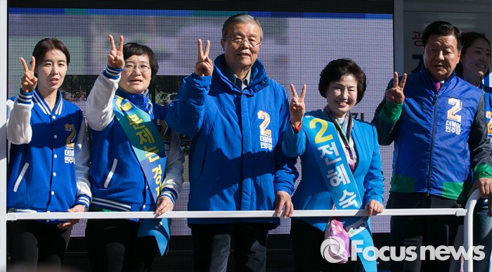 (서울=포커스뉴스) 4일 오전 전혜숙 더불어민주당 서울 광진갑 후보 선거사무소 인근 골목에서 김종인 비대위 대표 겸 선대위원장과 전 후보 등 참석자들이 지지를 호소하며 취재진을 향해 포즈를 취하고 있다. 오른쪽부터 이근식 부위원장, 전 후보, 김 대표, 문미옥, 박경미 비례대표 후보.