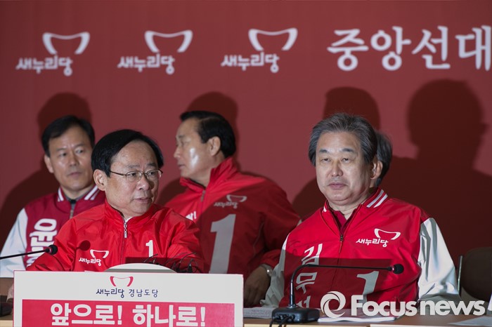 (창원=포커스뉴스) 김무성(앞줄 오른쪽) 새누리당 대표가 4일 오전 경남 창원시 의창구 원이대로 경남도당에서 열린 중앙선대위 현장 대책회의에 참석해, 이주영(앞줄 왼쪽) 경남권 선대위원장과 대화 있다.
