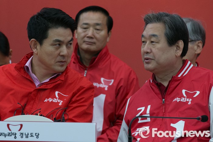 (창원=포커스뉴스) 김무성(오른쪽) 새누리당 대표가 4일 오전 경남 창원시 의창구 원이대로 경남도당에서 열린 중앙선대위 현장 대책회의에 참석해, 김태호(앞줄 왼쪽) 최고위원과 대화하고 있다.