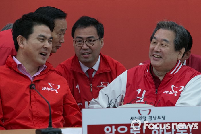 (창원=포커스뉴스) 김무성(오른쪽) 새누리당 대표가 4일 오전 경남 창원시 의창구 원이대로 경남도당에서 열린 중앙선대위 현장 대책회의에 참석해, 김태호(왼쪽) 최고위원, 이만기(오른쪽 두번째) 후보와 대화 중, 크게 웃고 있다.