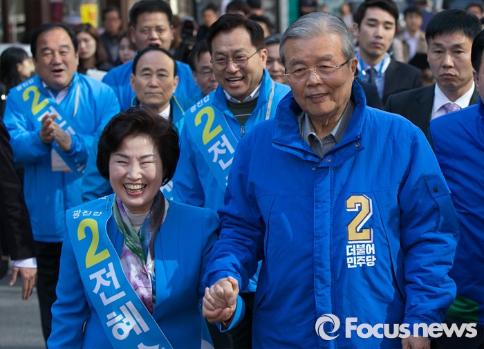 (서울=포커스뉴스) 4일 오전 전혜숙 더불어민주당 서울 광진갑 후보 선거사무소에서 중앙선거대책위원회의를 마친 김종인(오른쪽) 비대위 대표 겸 선대위원장과 전 후보가 손을 잡고 유세차량으로 이동하고 있다.