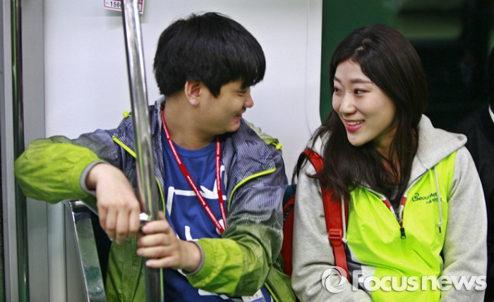 실습 후 지적장애인들은 지하철을 타고 잠실역으로 이동하며 전동차 내 장애인을 위한 편의시설을 살펴본다.