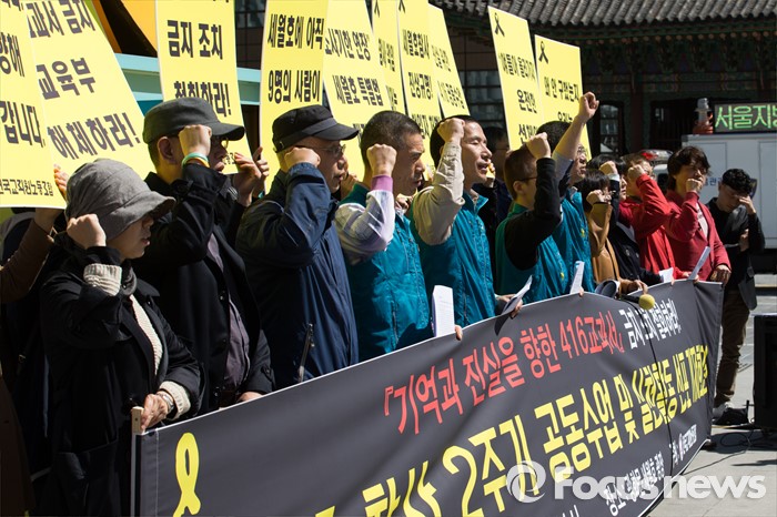 (서울=포커스뉴스) 4일 오전 서울 광화문광장에서 전국교직원노동조합 조합원들이 세월호 참사 2주기 공동수업 및 실천활동 선포 기자회견 중 교육부의 416교과서 금지 조치 철회 촉구하는 구호를 외치고 있다.