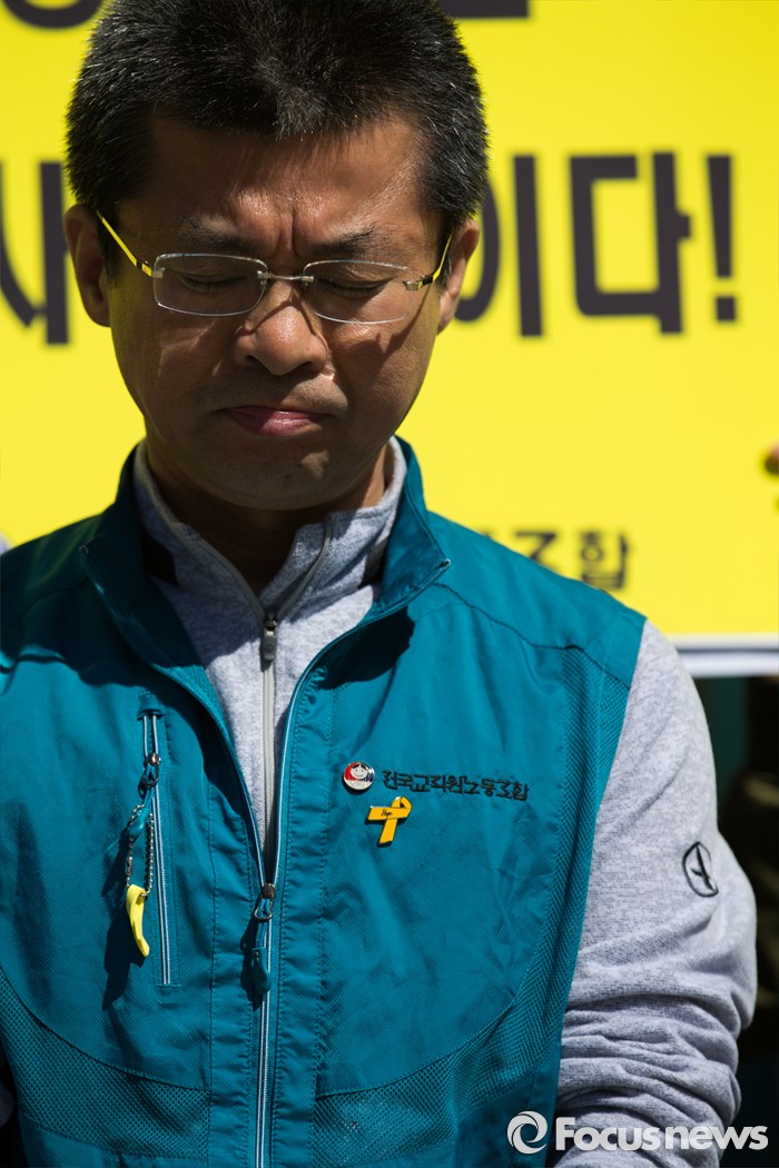 (서울=포커스뉴스) 4일 오전 서울 광화문광장에서 전국교직원노동조합 한 조합원이 세월호 참사 2주기 공동수업 및 실천활동 선포 기자회견 중 묵념하고 있다.