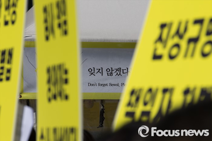 (서울=포커스뉴스) 4일 오전 서울 광화문광장에서 전국교직원노동조합 조합원들이 세월호 참사 2주기 공동수업 및 실천활동 선포 기자회견을 하고 있다.