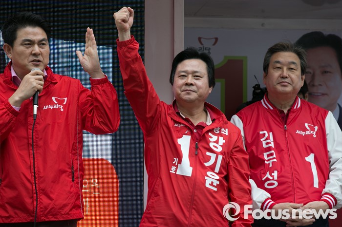 (창원=포커스뉴스) 김태호(왼쪽) 새누리당 최고위원이 4일 오전 경남 창원시 성산구 가음정시장 앞에서 강기윤(가운데) 창원시성산 후보 지원유세에 참석해, 연설을 하고 있다. 오른쪽은 김무성 대표.