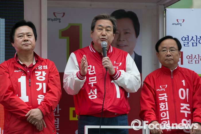 (창원=포커스뉴스) 김무성(가운데) 새누리당 대표가 4일 오전 경남 창원시 성산구 가음정시장 앞에서 강기윤(왼쪽) 창원시성산 후보 지원유세를 하고 있다.
