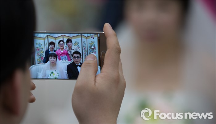 (대전=포커스뉴스) 4일 오전 대전 유성구 호텔ICC에서 열린 제18회 대전장애인자활실천대회 및 합동결혼식에서 신랑신부가 지인들과 사진을 촬영하고 있다.