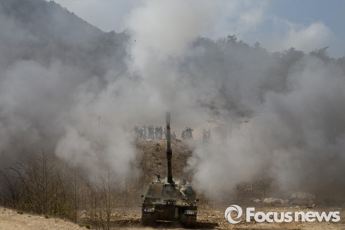 (고성=포커스뉴스) 4일 오전 강원도 고성 야촌리사격장에서 열린 '2016년 전반기 해상사격 훈련'에서 육군 8군단 포병대대 소속 K-9 자주포가 사격을 하고 있다.