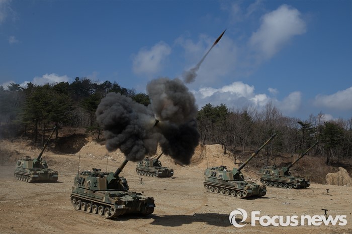(고성=포커스뉴스) 4일 오전 강원도 고성 야촌리사격장에서 열린 '2016년 전반기 해상사격 훈련'에서 육군 8군단 포병대대 소속 K-9 자주포가 사격을 하고 있다.