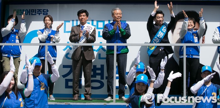 (성남=포커스뉴스) 4일 오후 경기도 서현역 인근 거리에서 열린 더불어민주당 성남 분당구 선거유세에 참석한 김종인(왼쪽 네번째) 비대위 대표 겸 선대위원장과 김병관(오른쪽 두번째) 분당갑 후보, 김병욱(왼쪽 세번째) 분당을 후보, 비례대표 후보들이 로고송에 맞춰 율동을 선보이고 있다.