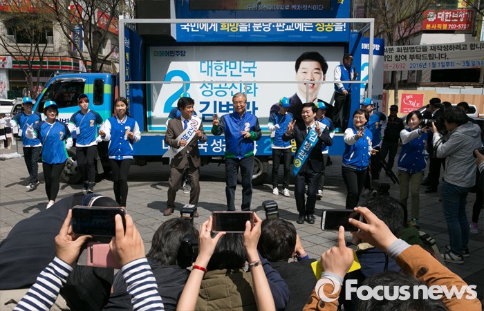 (성남=포커스뉴스) 4일 오후 경기도 서현역 인근 거리에서 열린 더불어민주당 성남 분당구 선거유세에 참석한 김종인 비대위 대표 겸 선대위원장과 김병관 분당갑, 김병욱 분당을 후보, 비례대표 후보들이 로고송에 맞춰 율동을 선보이고 있다.
