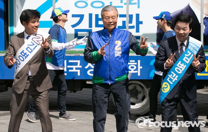 (성남=포커스뉴스) 4일 오후 경기도 서현역 인근 거리에서 열린 더불어민주당 성남 분당구 선거유세에 참석한 김종인(가운데) 비대위 대표 겸 선대위원장과 김병관(오른쪽) 분당갑, 김병욱 분당을 후보가 로고송에 맞춰 율동을 선보이고 있다.