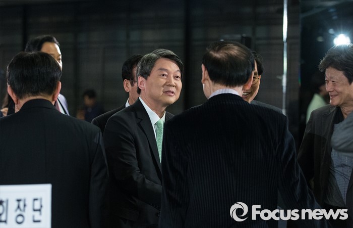 | △ 초청 토론회에서 인사 나누는 안 대표 |