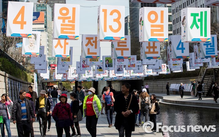 (서울=포커스뉴스) 4일 오후 서울 청계천 모전교에서 광통교 사이에 4.13 제20대 국회의원선거를 알리는 조형물이 설치돼 있다.