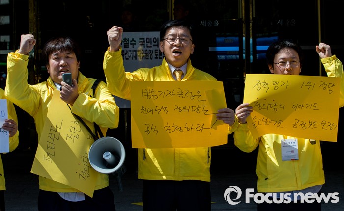표서울=포커스뉴스) 4일 오후 서울 종로구 세종문화회관 앞에서 열린 '정의당, 방송기자클럽 초청 토론회 배제에 대한 항의 긴급기자회견'에 참석한 이혁재 사무총장과 당직자들이 구호를 외치고 있다.
