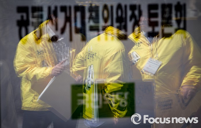 표서울=포커스뉴스) 4일 오후 서울 종로구 세종문화회관 앞에서 열린 '정의당, 방송기자클럽 초청 토론회 배제에 대한 항의 긴급기자회견'에 참석한 당직자들이 대화하고 있다.