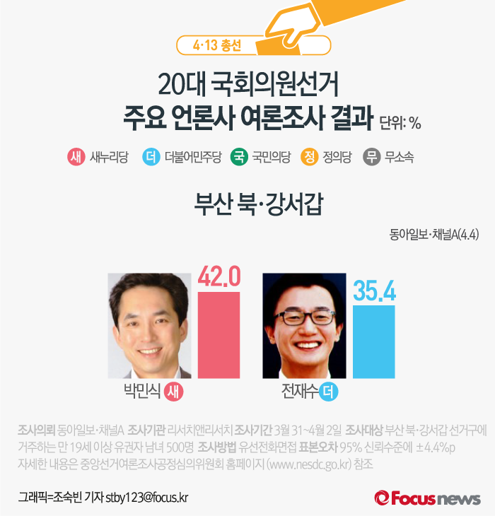 이번 여론조사는 1~2일 부상 북·강서갑 선거구에 거주하는 만 19세 이상 남녀 500명을 대상 유선전화면접조사 방식으로 진행됐다. 표본오차는 95% 신뢰수준에 ±4.4%포인트다. 자세한 내용은 중앙선거여론조사공정심의위원회 홈페이지(www.nesdc.go.kr)에서 찾아볼 수 있다.(서울=포커스뉴스) 동아일보와 채널A가 공동으로 여론조사기관 리서치&리서치에 의뢰해 3월 31일부터 4월 2일까지 조사해 4일 발표한 결과에 따르면 새누리당 박민식 의원의 지지율은 42.0%, 더민주 전재수 후보는 35.4%로 조사됐다.2016.04.04 조숙빈 기자