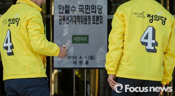 (서울=포커스뉴스) 4일 오후 서울 종로구 세종문화회관 앞에서 열린 '정의당, 방송기자클럽 초청 토론회 배제에 대한 항의 긴급기자회견'에 참석한 당직자들이 대화하고 있다.