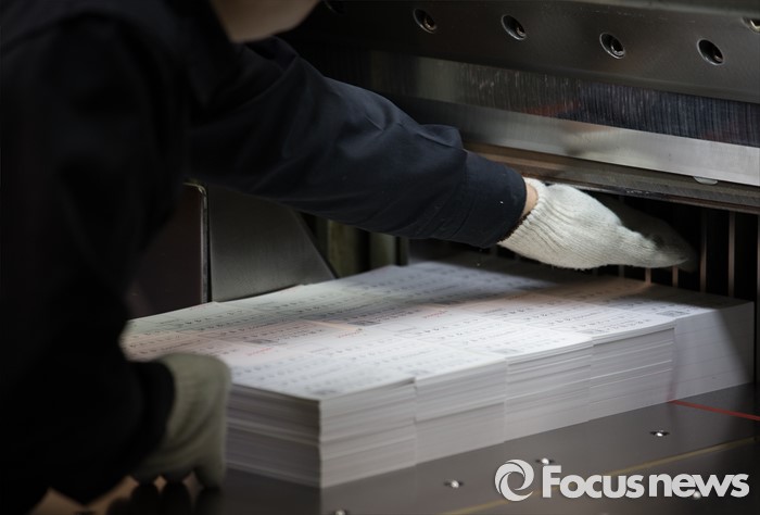 (서울=포커스뉴스) 제20대 국회의원 선거를 9일 앞둔 4일 오후 서울 영등포구 한 인쇄소에서 직원이 인쇄된 투표용지를 제단하고 있다.