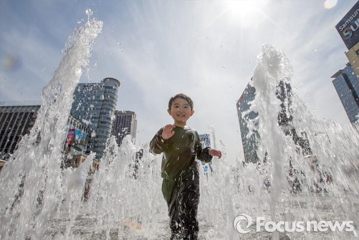 (서울=포커스뉴스) 4일 오후 서울 광화문광장 분수대에서 한 어린이가 물장난을 치고 있다.