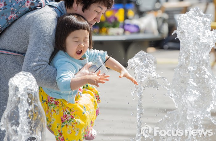 (서울=포커스뉴스) 4일 오후 서울 광화문광장 분수대에서 한 어린이가 물장난을 치고 있다.