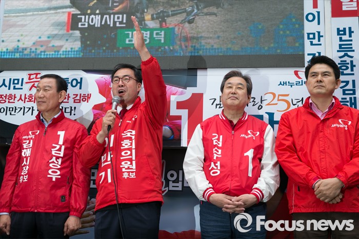 (김해=포커스뉴스) 이만기(왼쪽 두번째) 새누리당 김해을 후보가 4일 오후 경남 김해시 내외로 외동전통시장 앞에서 유세를 하고 있다.