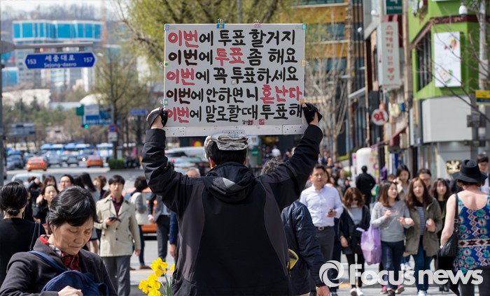 (서울=포커스뉴스) 4일 오후 서울 광화문광장에서 한 시민이 투표를 독려하는 손팻말을 들고 있다.