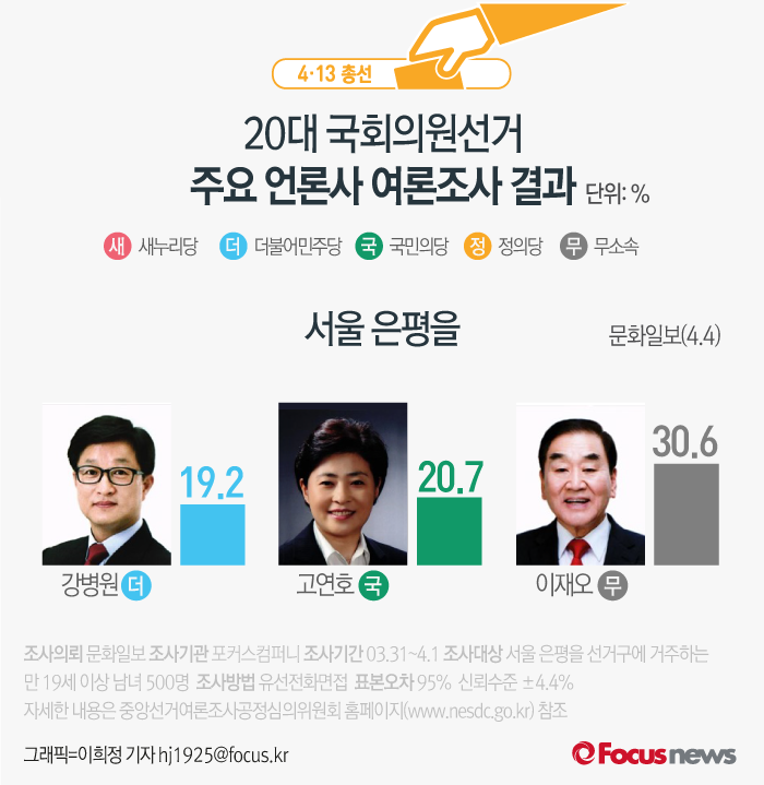 (서울=포커스뉴스) 문화일보가 포커스컴퍼니에 의뢰해 4일 발표한 여론조사 결과에 따르면 더불어민주당 강병원 후보의 지지율은 19.2%, 국민의당 고연호 후보의 지지율은 20.7%, 무소속 이재오 후보는 30.6%를 기록했다.
