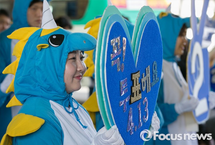 (용인=포커스뉴스) 4일 오후 경기도 이마트 죽전점 앞 광장에서 열린 더불어민주당 용인지역 합동유세에 참여한 선거운동원들이 피켓을 들고 지지를 호소하고 있다.