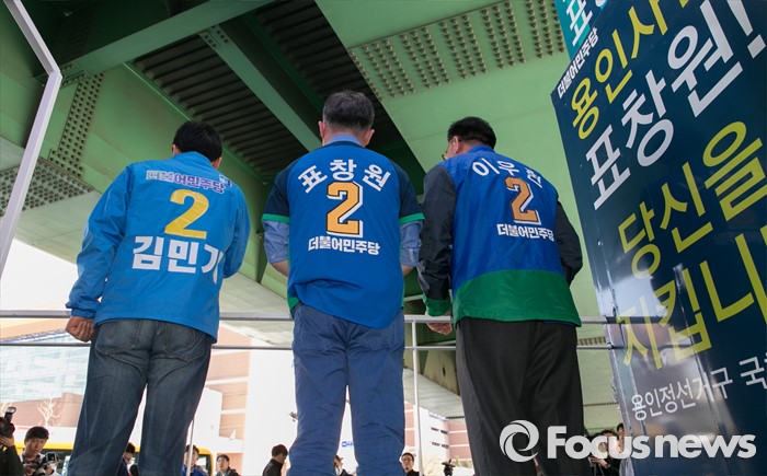 (용인=포커스뉴스) 4일 오후 경기도 이마트 죽전점 앞 광장에서 열린 더불어민주당 용인지역 합동유세에 참석한 김민기(왼쪽부터) 용인을, 표창원 용인정, 이우현 용인병 후보가 지지를 호소하고 있다.