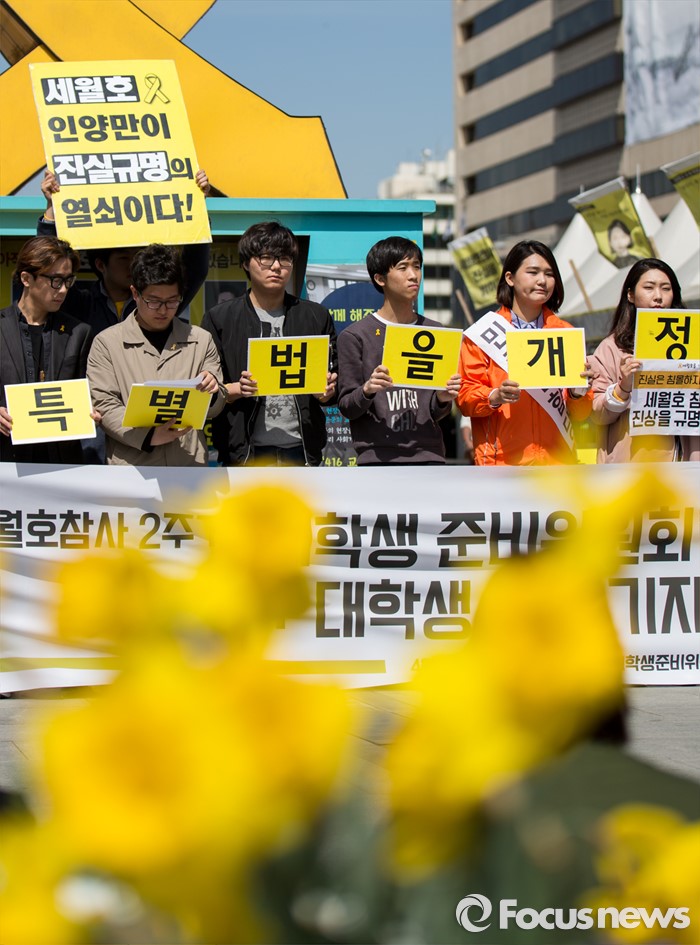 (서울=포커스뉴스) 4일 오후 서울 광화문광장에서 열린 4.16 세월호참사 2주기 대학생 준비위원회 발족식에 참석한 청년들이 특별법 재정을 촉구하는 손팻말을 들고 있다.