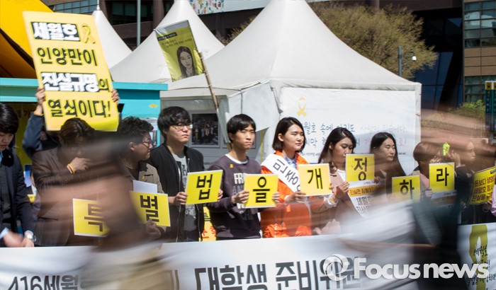 (서울=포커스뉴스) 4일 오후 서울 광화문광장에서 열린 4.16 세월호참사 2주기 대학생 준비위원회 발족식에 참석한 청년들이 특별법 개정을 촉구하는 손팻말을 들고 있다.