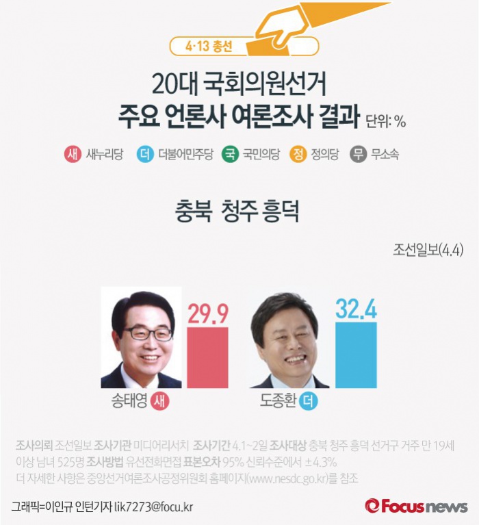 (서울=포커스뉴스) 조선일보가 여론조사기관 미디어리서치에 의뢰해 4일 발표한 결과에 따르면 충북 청주 흥덕 선거구 후보 지지율에서 더불어민주당 도종환 의원이 32.4%로 집계됐다. 이어 새누리당 송태영 후보가 29.9%, 무소속 김준환 후보가 6.6%를 기록했다.