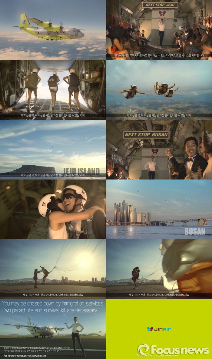 이날 공개한 1분20초 분량의 영상은 진에어가 대형 수송기를 통해 여객을 수송해 승객을 스카이다이빙으로 목적지에 떨어뜨리는 '다이렉트 드롭(Direct Drop) 서비스'를 실시한다는 내용을 담았다.