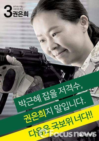 광주 광산을 권은희 후보 측은 총을 들고 있는 사진에 "박근혜 잡을 저격수, 권은희지 말입니다. 다음은 국보위 너다!!"는 문구가 적힌 포스터로 논란이 된 바 있다. 권 후보 측은 해당 포스터에 대해 "지지자가 작성한 것"이라며 관련 글을 삭제했다."박근혜 잡을 저격수, 권은희지 말입니다"는 내용이 담긴 선거포스터. 권은희 후보 측은 이를 지지자가 작성한 것이라고 일축했다 <사진출처=권은희 후보 페이스북> 2016.04.04 최형욱 기자 wook@focus.co.kr