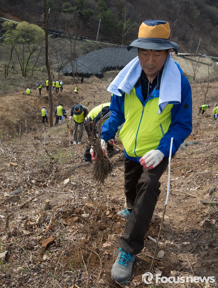 (세종=포커스뉴스) 김경환 국토교통부차관과 직원들이 식목일을 앞두고 4일 오후 세종시 금남면 영곡리 야산에서 나무심기를 하고 있다.