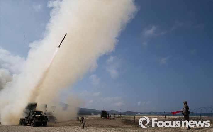 (고성=포커스뉴스) 4일 오후 강원도 고성 송지호해변에서 열린 '2016년 전반기 해상사격 훈련'에서 육군 8군단 포병대대 소속 130mm 다련장 구룡이 로켓탄을 발사하고 있다.