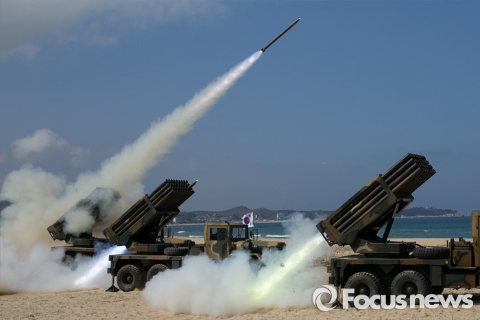 (고성=포커스뉴스) 4일 오후 강원도 고성 송지호해변에서 열린 '2016년 전반기 해상사격 훈련'에서 육군 8군단 포병대대 소속 130mm 다련장 구룡이 로켓탄을 발사하고 있다.