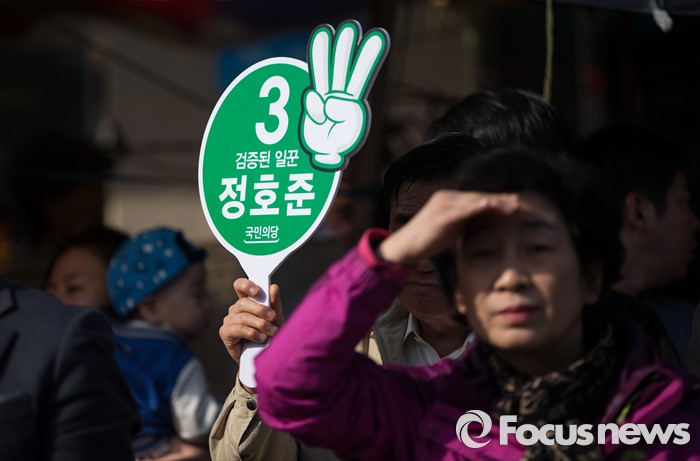 (서울=포커스뉴스) 4일 오후 서울 성동구 금남시장 로터리에서 정호준 성동구을 후보가 선거운동을 하고 있는 가운데 정 후보를 지지하는 유권자들이 기호 3번 피켓을 들고 있다.