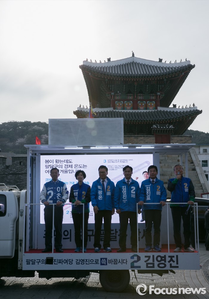 (수원=포커스뉴스) 4일 오후 경기도 수원 팔달문시장 앞에서 열린 더불어민주당 수원지역 합동유세에 참석한 김종인 비대위 대표 겸 선대위원장이 지지를 호소하고 있다. 왼쪽부터 이찬열 수원갑, 백혜련 수원을, 박광온 수원정, 김영진 수원병, 김진표 수원무 후보, 김 대표.