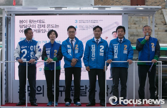 (수원=포커스뉴스) 4일 오후 경기도 수원 팔달문시장 앞에서 열린 더불어민주당 수원지역 합동유세에 참석한 김종인 비대위 대표 겸 선대위원장이 지지를 호소하고 있다. 왼쪽부터 이찬열 수원갑, 백혜련 수원을, 박광온 수원정, 김영진 수원병, 김진표 수원무 후보, 김 대표.