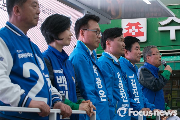 (수원=포커스뉴스) 4일 오후 경기도 수원 팔달문시장 앞에서 열린 더불어민주당 수원지역 합동유세에 참석한 김종인 비대위 대표 겸 선대위원장이 지지를 호소하고 있다. 왼쪽부터 이찬열 수원갑, 백혜련 수원을, 박광온 수원정, 김영진 수원병, 김진표 수원무 후보, 김 대표.