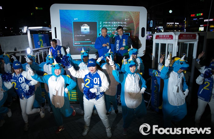 (안양=포커스뉴스) 4일 오후 경기도 지하철 1호선 안양역 앞 광장에서 김종인(왼쪽) 더불어민주당 비대위 대표 겸 선대위원장과 안양만안구 후보인 이종걸 원내대표가 유세단과 함께 율동을 추며 지지를 호소하고 있다.