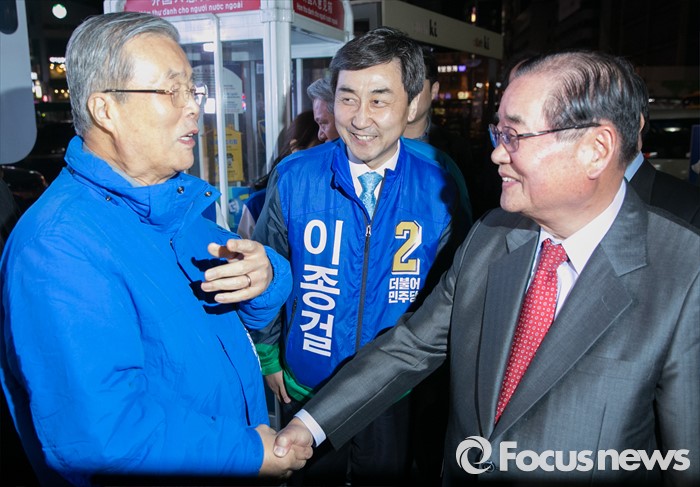 (안양=포커스뉴스) 4일 오후 경기도 지하철 1호선 안양역 앞 광장에서 선거유세를 마친 김종인(왼쪽) 더불어민주당 비대위 대표 겸 선대위원장과 안양 만안구 후보인 이종걸(가운데) 원내대표, 이 원내대표의 사촌형인 이종찬 전 국정원장이 인사하고 있다.