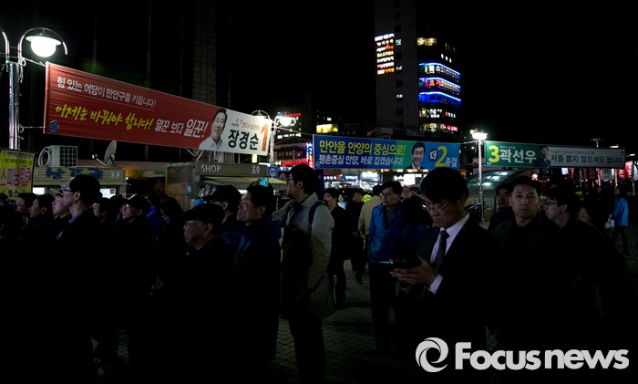 (안양=포커스뉴스) 4일 오후 경기도 지하철 1호선 안양역 앞 광장에 각 정당 후보들의 현수막이 걸려 있다.