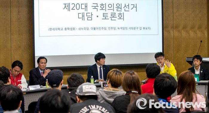이성헌 새누리당 후보, 우상호 더불어민주당 후보, 이종화 민주당 후보, 김영준 녹색당 후보는 4일 서울 서대문구 연세대학교 백양누리관에서 열린 제20대 국회의원선거 대담·토론회에 참석해 청년들과 함께 청년 문제를 고민하는 시간을 가졌다.