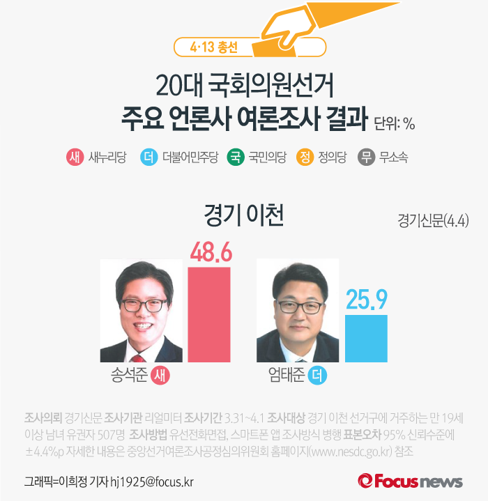 (서울=포커스뉴스) 경기신문이 리얼미터 의뢰해 4일 발표한 여론조사 결과에 따르면 새누리당 송석준 후보의 지지율은 48.6%, 더불어민주당 엄태준 후보의 지지율은 25.9%를 기록했다.