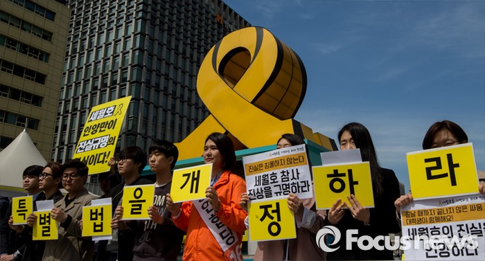 한편 세월호특조위 2차 청문회는 지난달 28~29일 서울시청 다목적홀에서 진행됐다.4일 오후 서울 광화문광장에서 열린 4·16 세월호참사 2주기 대학생 준비위원회 발족식에 참석한 청년들이 특별법 개정을 촉구하는 손팻말을 들고 있다. 2016.04.04 양지웅 기자